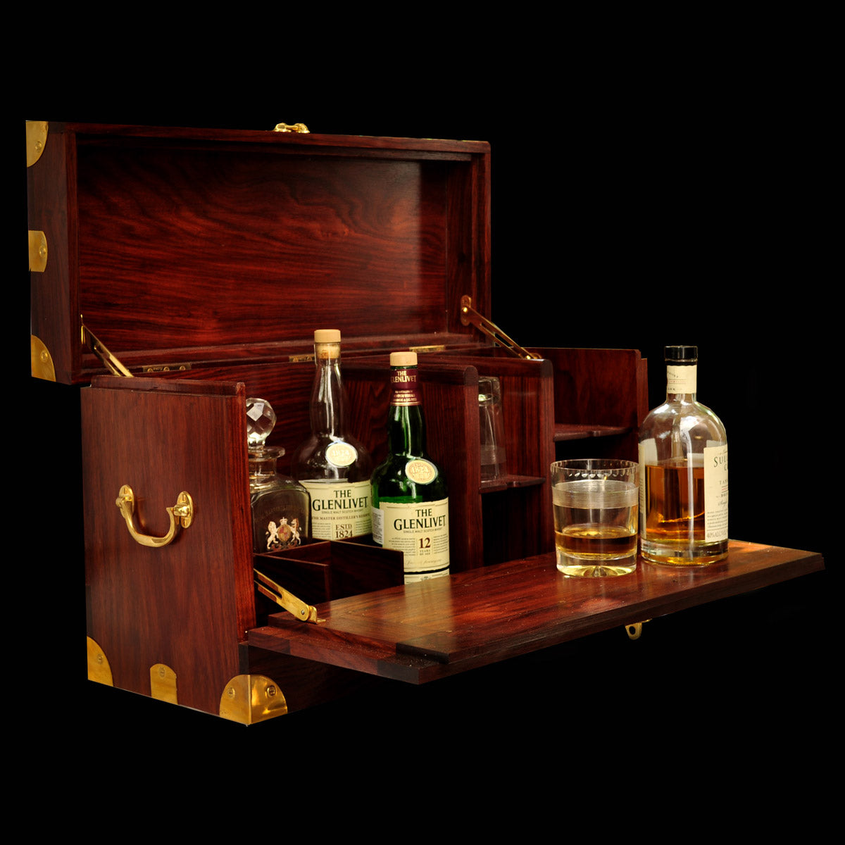 Handcrafted from 100% rosewood, the bar features removable partitions for a custom fit, with a dedicated spot for a decanter and cups, or space for books when the spacers are removed. Combining functionality with classic sophistication, it is perfect for entertaining or adding a refined touch to your décor.