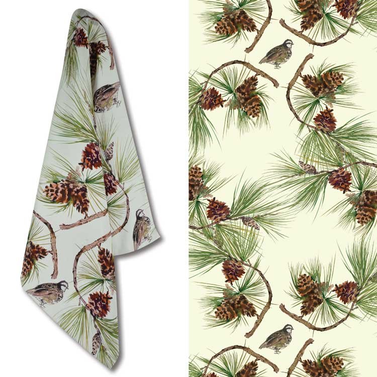 Bring the outdoors inside with Kevin’s exclusive Longleaf Pine and Bobwhite Quail Fabric. Inspired by the rare Longleaf Pine forests of the Red Hills and the beloved Bobwhite quail that inhabit them, this design was created from original paintings by a local Georgia artist. It captures the essence of Southern sporting life with rich detail and natural beauty.