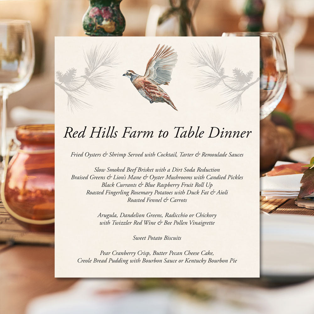 As part of Kevin’s 9th Annual Game Fair, we’re thrilled to announce the return of the Red Hills Farm to Table Dinner, an unforgettable evening at Mistletoe Plantation on Friday, November 7, 2025.