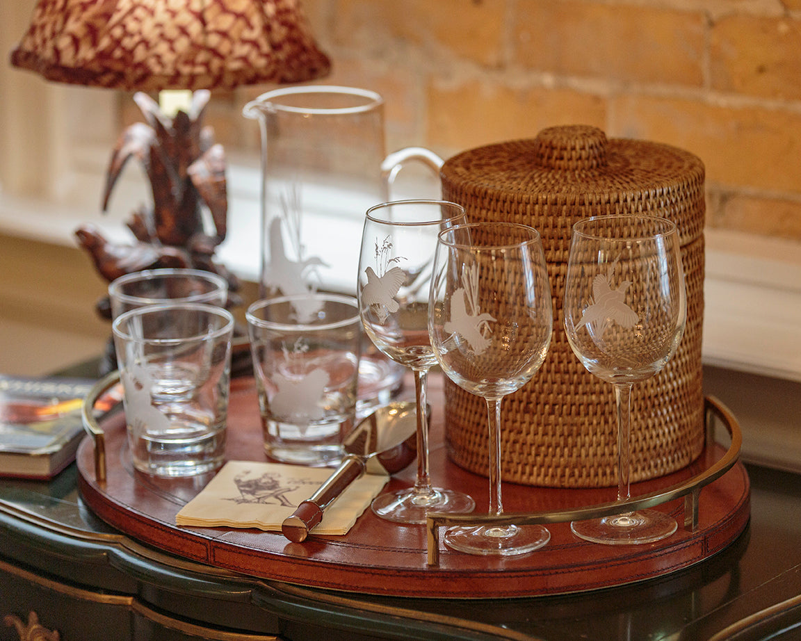 Available in three classic motifs — quail, duck, or pheasant — each design is delicately etched into premium glass, making it a standout addition to your home bar or collection.