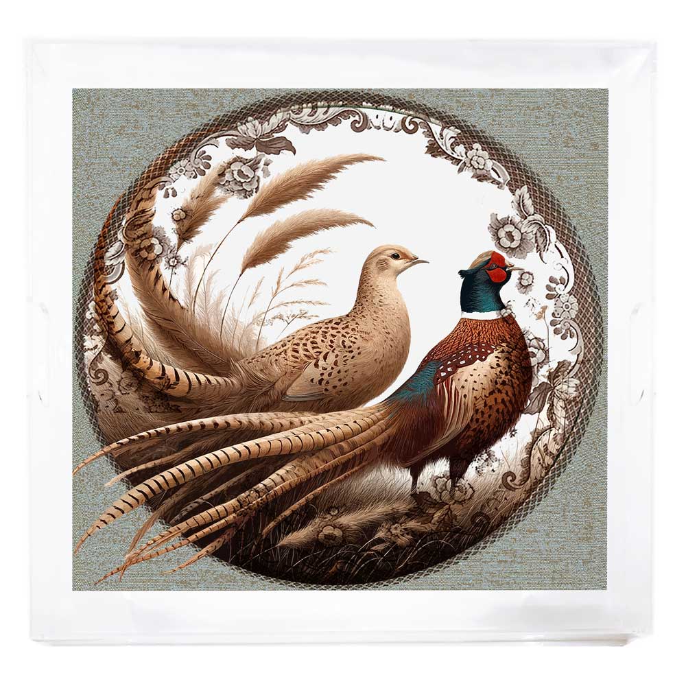Dieses quadratische, extra große Acryltablett ist atemberaubend! Das Federdesign dieser wunderschönen, lebendigen Fasanenfedern ist absolut exquisit. Stellen Sie dieses Tablett bei Ihrem nächsten Treffen auf Ihr Sideboard oder Ihre Ottomane und Sie werden mit Sicherheit Komplimente erhalten. Modernes Design, tadellose Materialien; Beispiellose Handwerkskunst. Hergestellt in den USA.