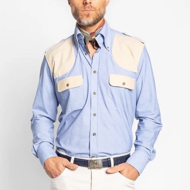 Designed for the ultimate flexibility and handcrafted to withstand the most challenging outdoor elements, this shooting shirt by Hadleigh is a must-have for any refined sportsman. Made with luxurious nylon spandex and featuring tan or blue corduroy patches, two-button cuffs, and pleated back detailing, it is the epitome of practicality and sophistication. Handmade in Italy for superior quality and craftsmanship, experience Hadleigh's elevated take on the classic shooting shirt.