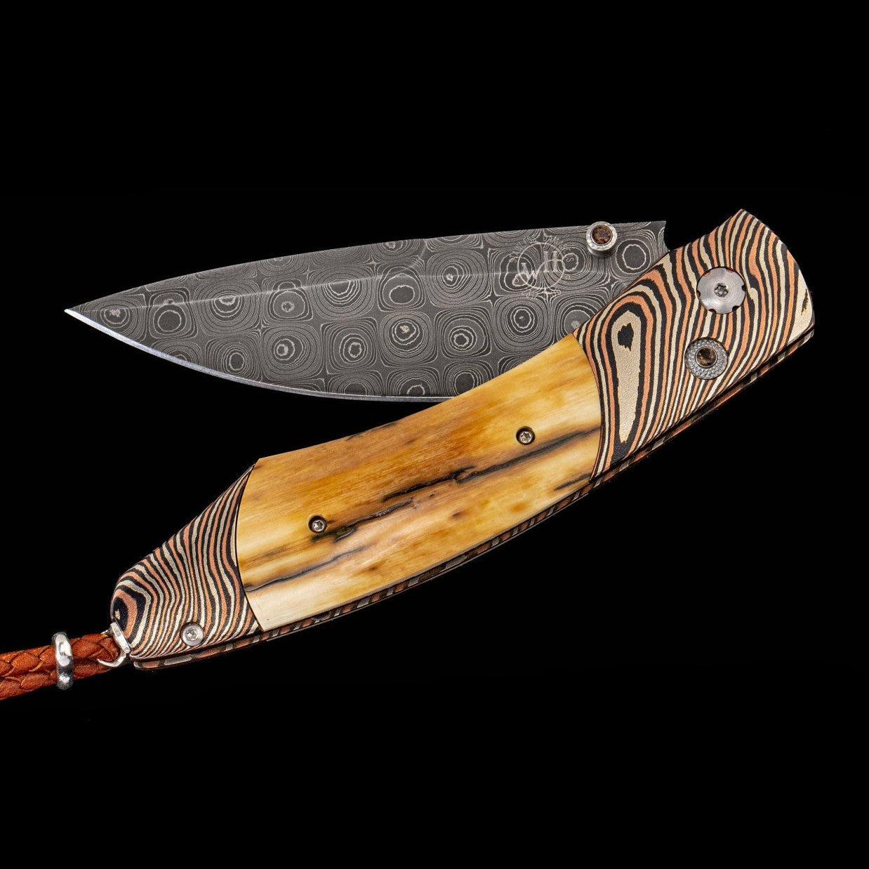 The Spearpoint ‘Bark’ features a beautiful frame in hand-forged 'Twist' Mokume gane by Mike Sakmar, inlaid with an exterior cut, or 'bark', of 10,000-year-old Woolly Mammoth tusk. The blade is hand-forged 'Raindrop' damascus by Mike Norris; the one-hand button lock and the thumb stud are set with smoky quartz gemstones. A remarkable design that gives you an instrument with a full-size secure grip, and a versatile deep-belly blade, the Spearpoint epitomizes William Henry’s core philosophy – that superlative function deserves to be elevated to superlative art. The ‘Bark’ features some of the most exotic materials, artistry and forged metals that are the hallmark of William Henry's collections; a timeless heirloom to be proudly worn and used for a lifetime before being handed down to another generation.
