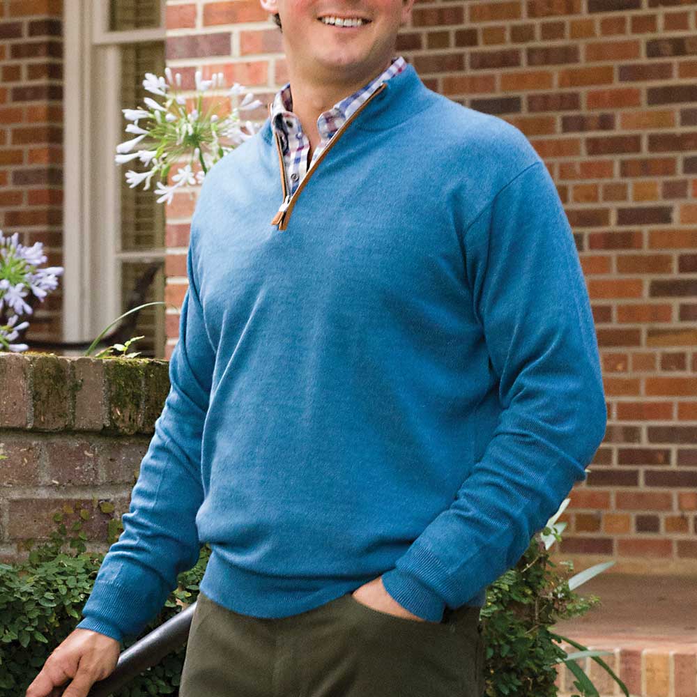 • Pull homme 80 % laine mérinos / 14 % soie / 6 % nylon à quart de zip