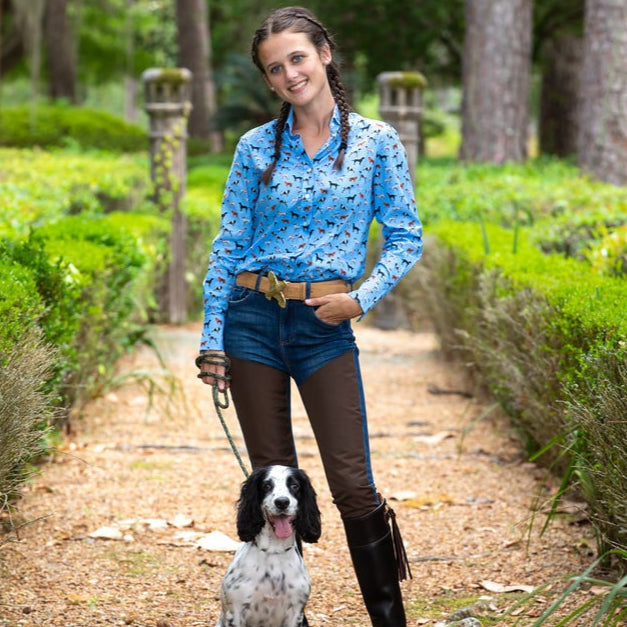 Adorned with detailed artwork featuring classic sporting dog breeds—including the Labrador, English Setter, English Cocker, and Pointer—this blouse celebrates heritage and style. Whether in the field or in town, it makes a statement of timeless sporting elegance while offering effortless versatility.