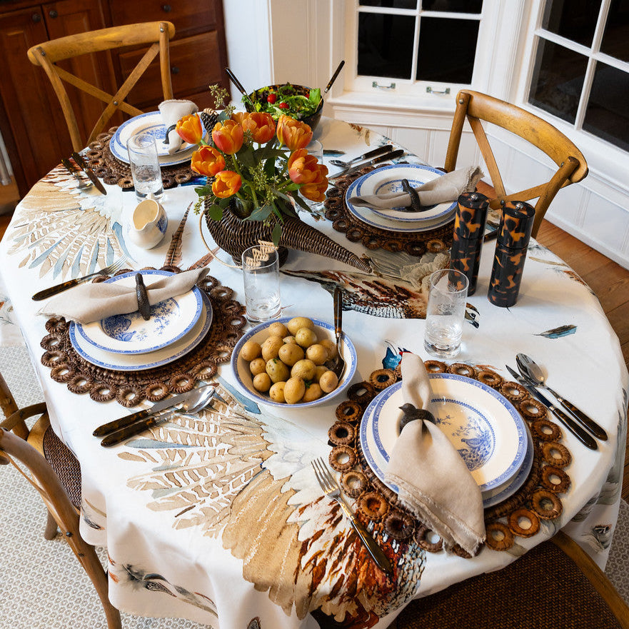 Nouvelle forme et motif ! Élégamment à l'aise sur une table en acajou pendant les vacances d'hiver, ou confortablement à l'extérieur sur une table de pique-nique en ciment. La porcelaine de caille bleue et brune anglaise établit un standard élevé. Passe au lave-vaisselle et au micro-ondes. Fait en angleterre. 10 1/2" de diamètre, disponible en bleu ou marron.