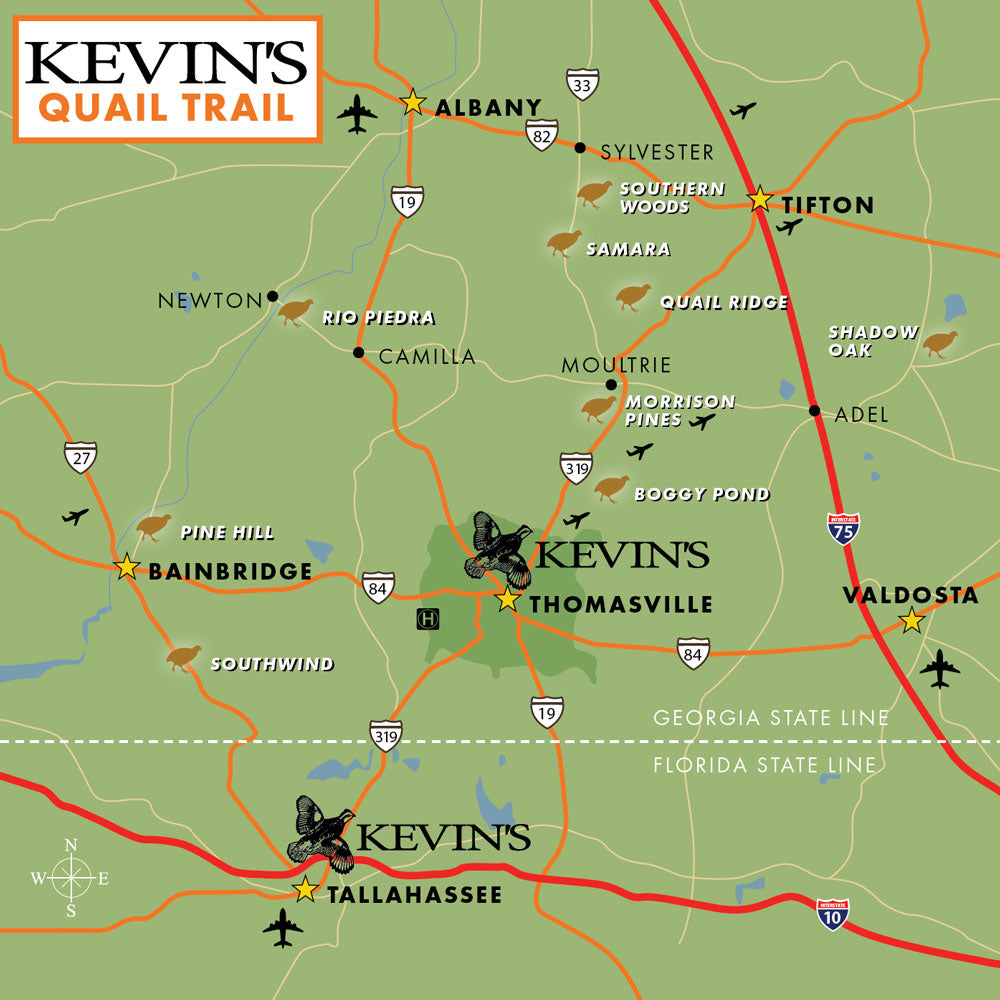 Kevin’s is situated in the historical and famous Bob White Quail Capital of the World located within the Red Hills of N. Florida and S.W. Georgia. Our family business has built a 40 year old lifestyle company around this special culture. The quail population is unique to our area because of long leaf pine forests, wiregrass, clay/sandy soil and the commitment to conservation. Many upland bird hunters from around the world visit our area to quail hunt and enjoy southern hospitality. To promote and show our gratitude towards the preserves in our area, we have composed a map of the properties that we have built relationships with over many years and are proud to recommend to our customers. These hunting preserves each offer their own unique style and services and have a long history of success. You may learn more details about each property by visiting their websites. We encourage you to jump on the Quail Trail and experience some of the finest quail hunting in the world. Come visit us at Kevin’s of Thomasville and enjoy one of the finest gun rooms in the world!