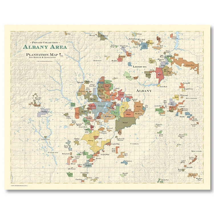 Developed from the private collection of Jon Kohler, a plantation broker and conservation expert with 27 years of experience, this map details iconic quail plantations established in the early 1900s alongside recently developed high-quality recreational properties. As the second map in the series covering all seven “Plantation Belts,” it emphasizes the significance of private land stewardship. Portions of proceeds benefit Tall Timbers Research Station & Land Conservancy.