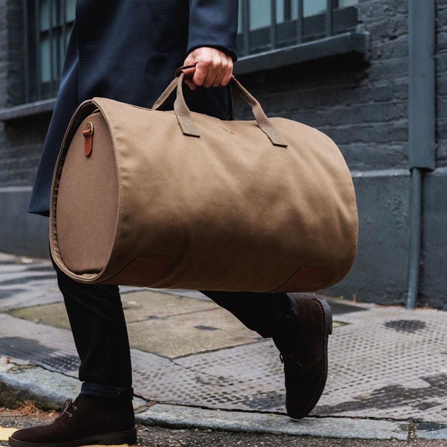 Crafted in England from 24oz British dyed waterproof cotton canvas (suit carrier) and 18oz proofed canvas twill (holdall), it features premium veg-tanned Italian leather, solid brass hardware welded in London, and YKK golden brass zips. Designed with airline carry-on compliance in mind, it also includes a removable waterproof shoe bag, slimline coat hanger, and external pocket for essentials.