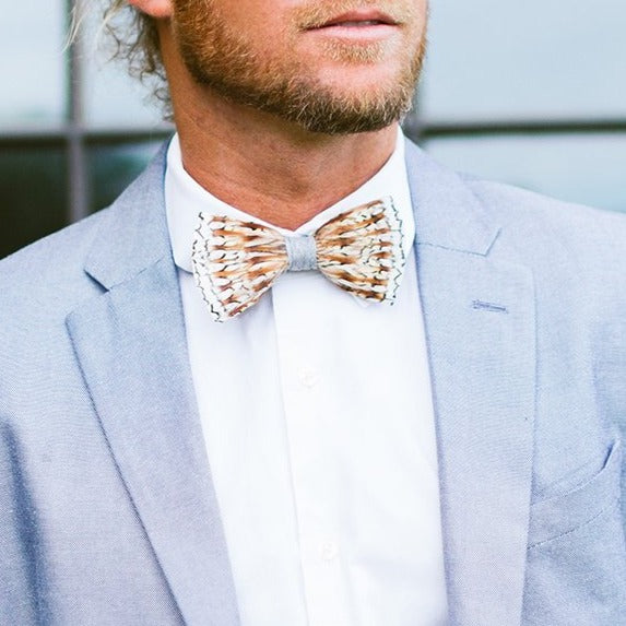 The Bobwhite Feather Bow Tie is inspired by generations of friends embracing the outdoors from dawn to dusk. Celebrating the joy of unplugging and connecting with nature, this bow tie embodies a truly original design for a truly original feather. Bobwhite quail feathers are carefully layered and finished with a grosgrain wrap, creating a distinctive accessory that commands attention.