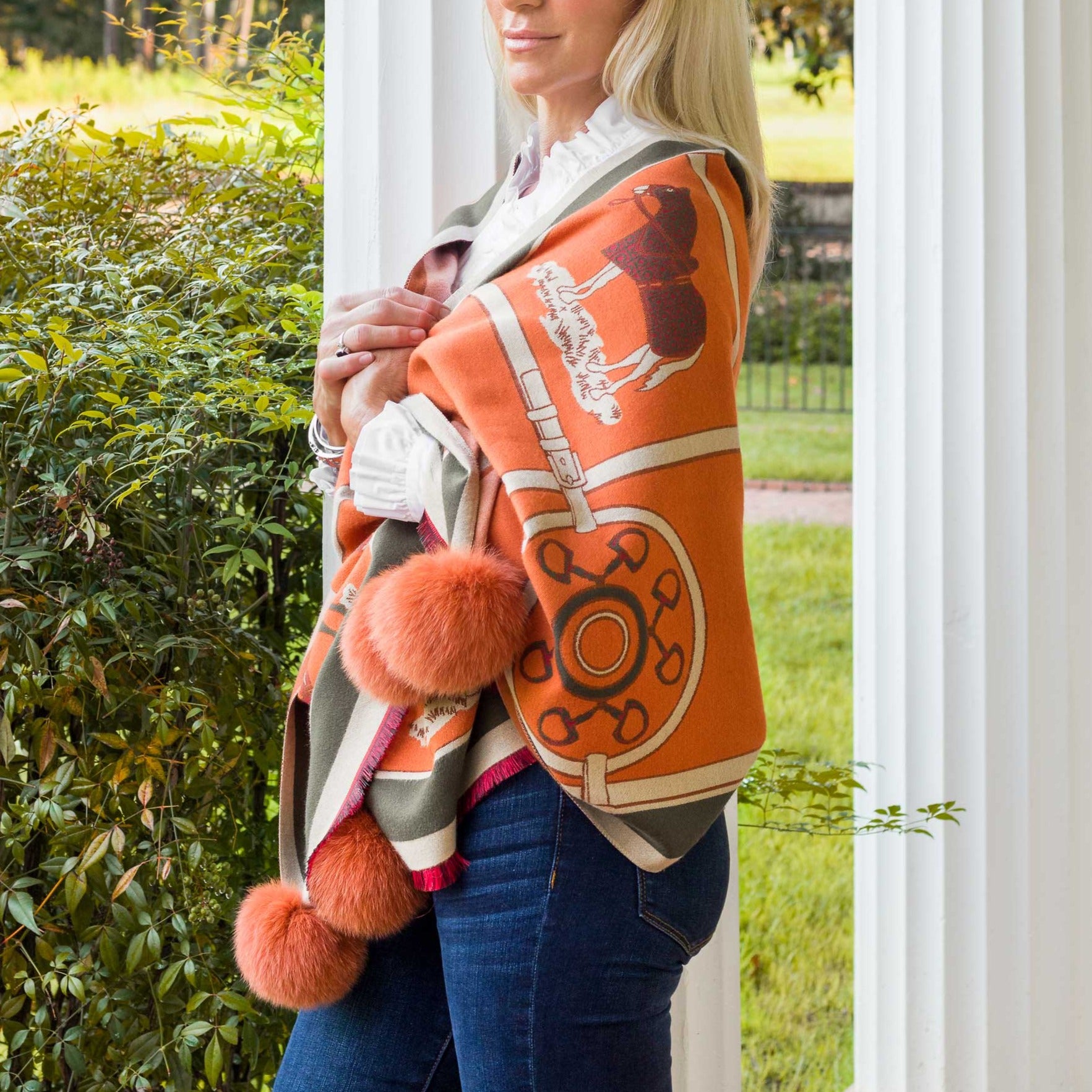 Perfect for layering over your outfit or draping as a decorative throw, this wrap is finished with playful fox fur pom poms for added sophistication and charm. Whether worn in the field or used to elevate your living space, it combines luxury, artistry, and functionality in one elegant design.