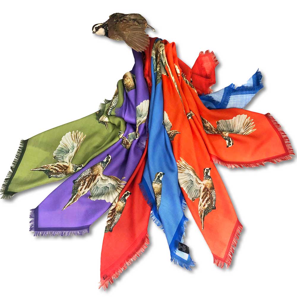 Our experts designed these silk-wool scarves with Kat McCall's commissioned Bob White quail artwork. Each piece is lightweight for year-round wear, made extra comfortable with soft and non-irritating wool. Manufactured in Italy, the scarves measure 34x34 inches in size. Wear them on your next quail hunt, or as a fashionable addition to any daily look.