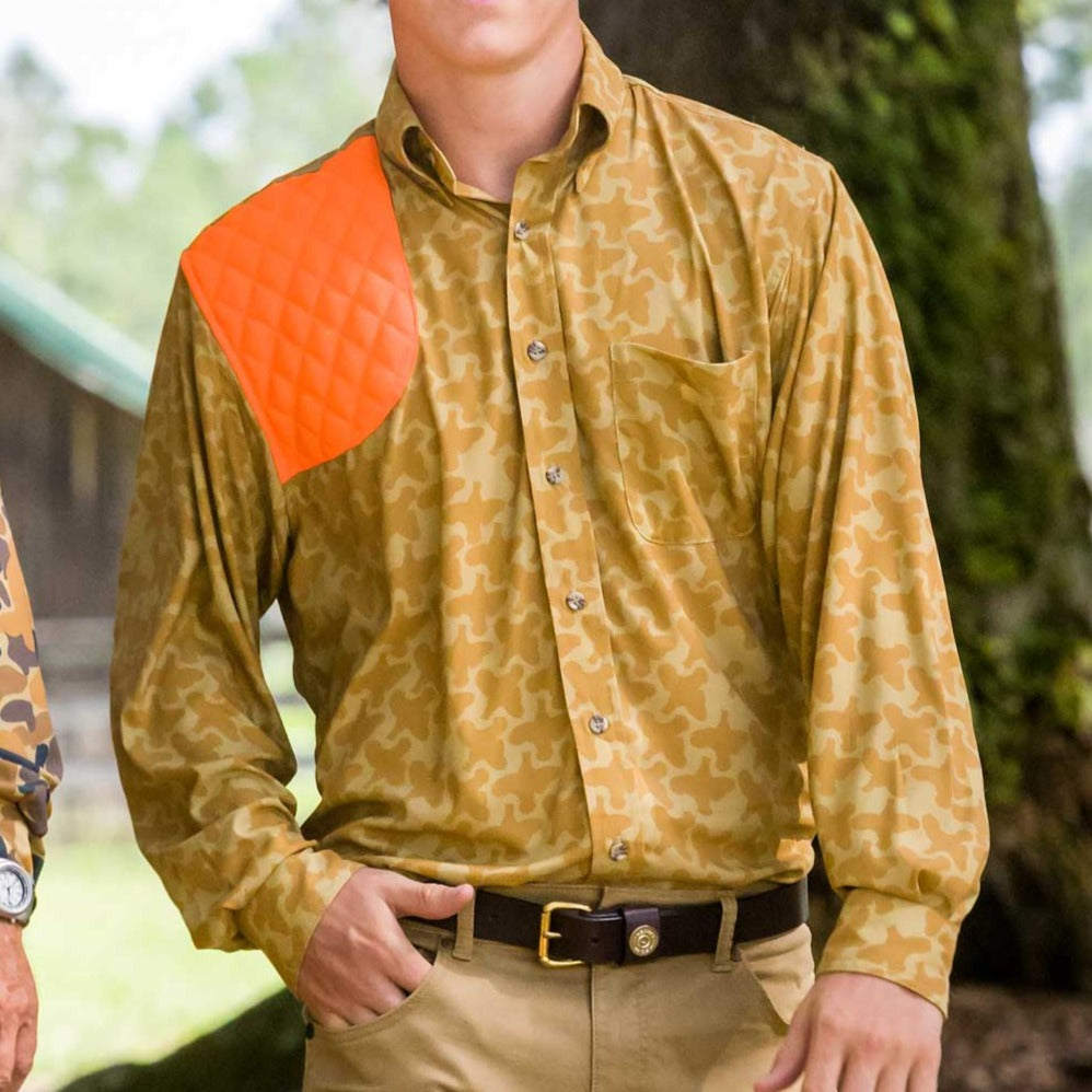 Perfect for the fashionable quail hunter, the Upland Bird patterned shooting shirt combines classic style with high-performance features. Crafted from Kevin’s exclusive performance fabric, this shirt offers a full cut for comfort and freedom of movement, enhanced by safety orange detailing for added visibility in the field.