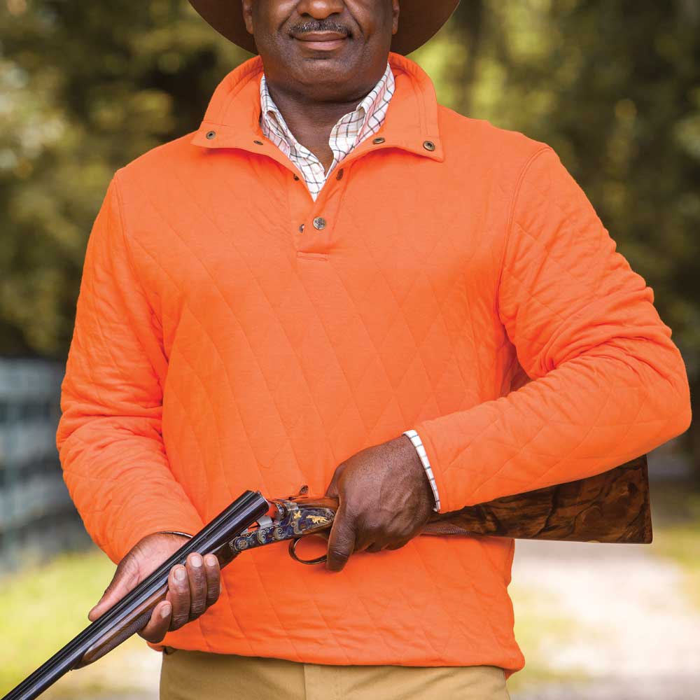 The Kevin's Quilted 1/4 Snap Pullover is perfect for upland hunting or cool days when light protection is needed. Crafted from quilted cotton jersey with a light poly-fill, it provides warmth without restricting movement. The quail-embossed snap buttons add a signature touch, while the cut-for-movement design ensures comfort during active pursuits.