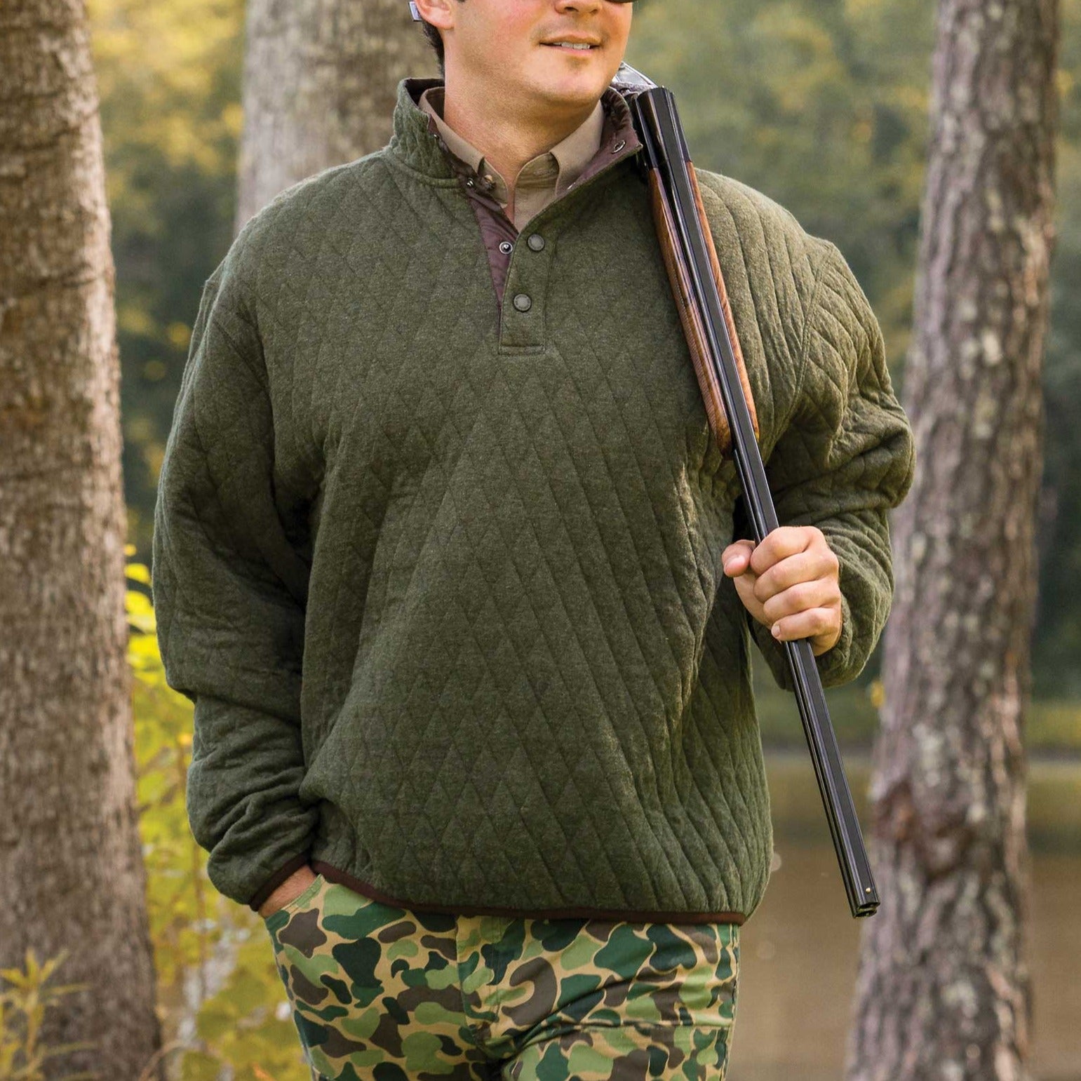 Ideal for upland hunting or casual outdoor wear, this quilted snap mock pullover provides lightweight warmth and comfort on cool days. Made from quilted cotton jersey with light poly-fill, it features a 1/4 zip front for easy layering and ventilation.
