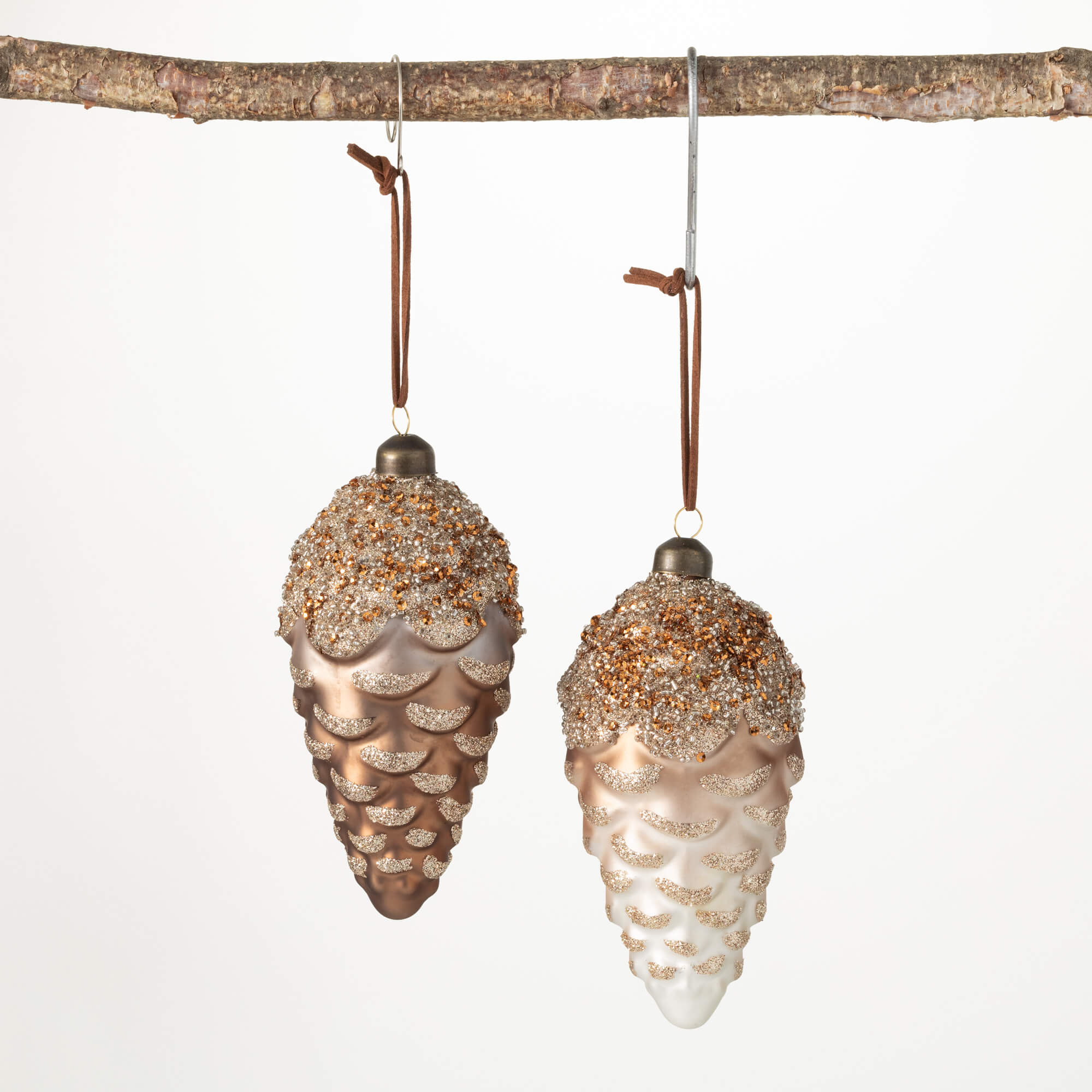 Celebrate the season in style with these highly collectible vintage glass pinecone ornaments. Inspired by nature, each ornament is crafted from rustic brown glass with a frosted base and a shimmering beaded top, creating a luxurious and timeless holiday look. A Sullivans exclusive, this set of unique ornaments brings natural beauty and vintage charm to your Christmas decor.