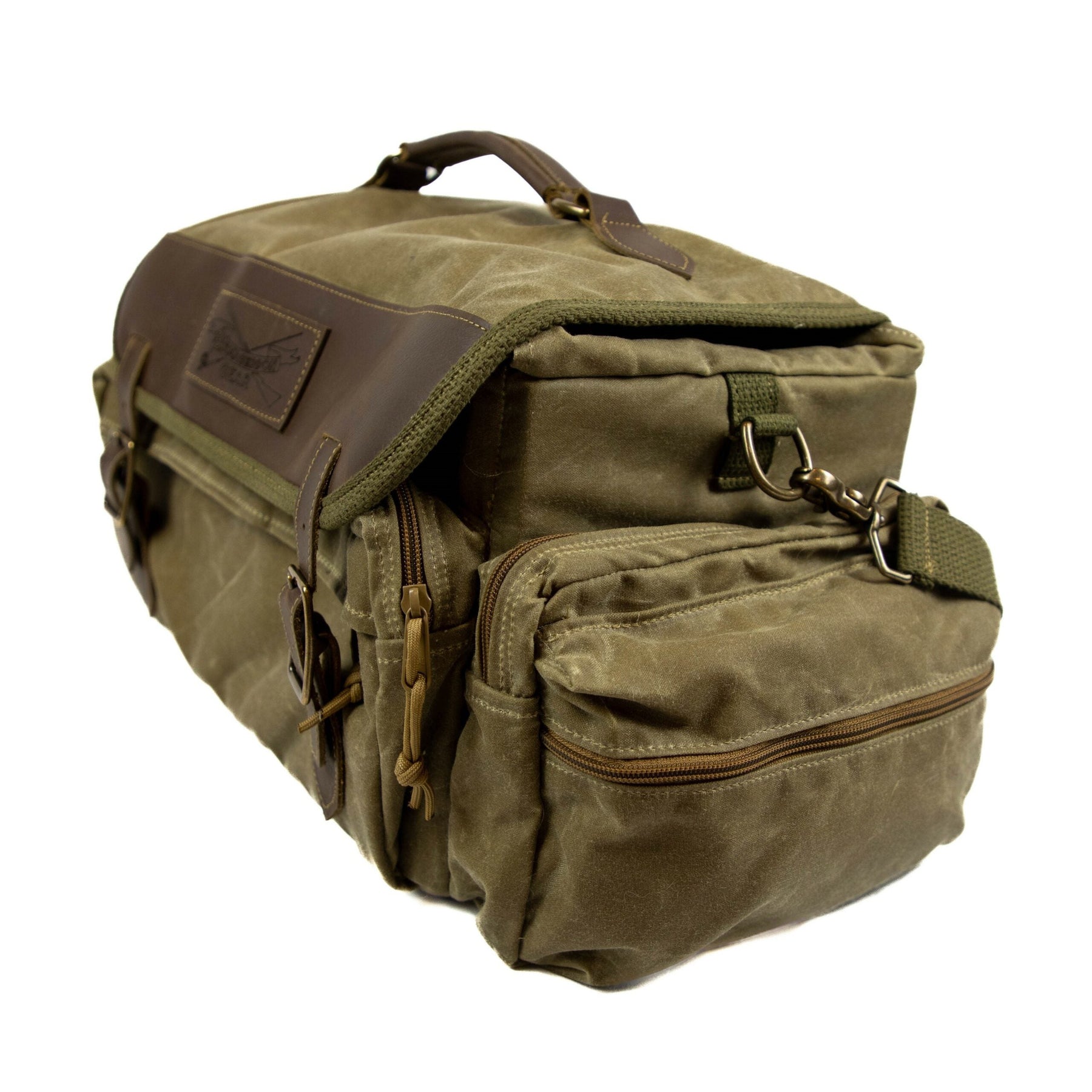 The Armageddon Gear Waterfowlers Blind Bag is built to endure both the elements and the test of time. Constructed from double-waxed canvas for weather resistance and paired with hand-selected water buffalo leather, each bag is cut and crafted to exacting standards for unmatched durability. Antique brass hardware adds a timeless touch, while a 1000D Cordura underside ensures rugged performance and water resistance in the harshest conditions.