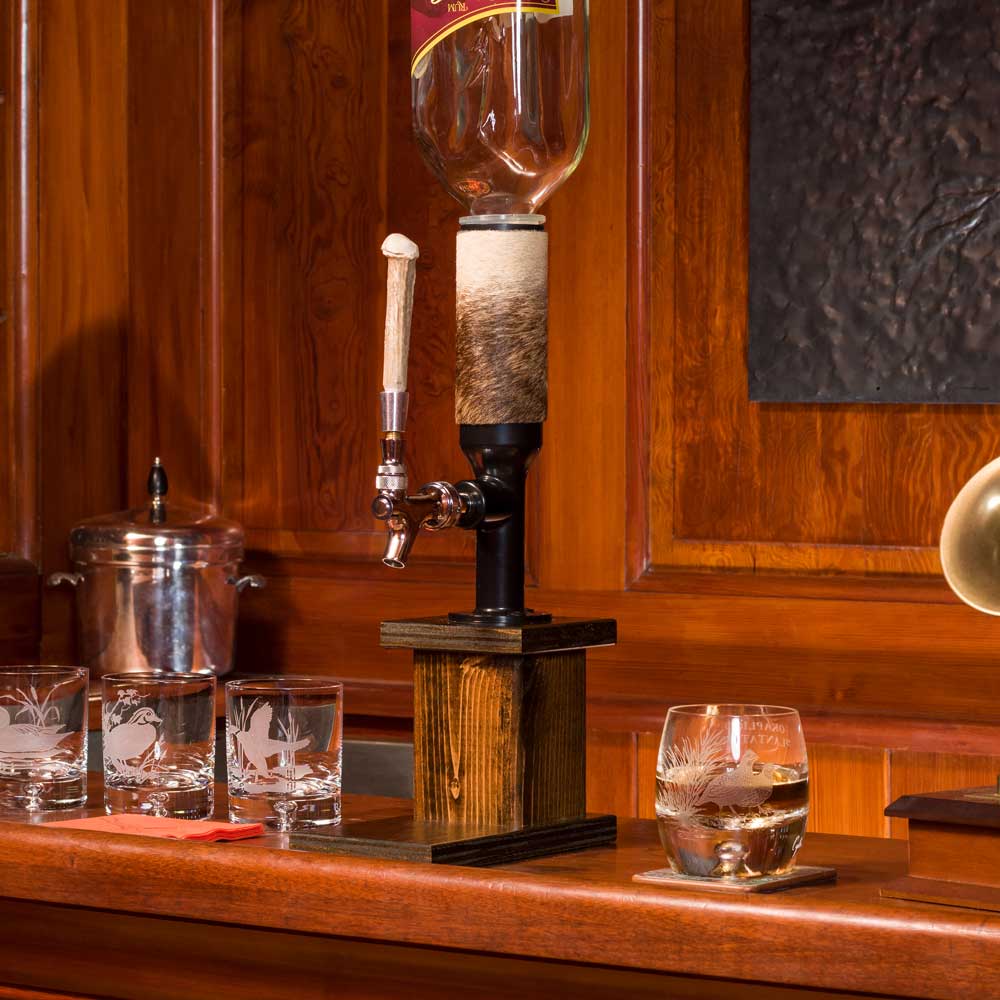 Elevate your home bar with our handmade, unique whiskey tower, a perfect combination of functionality and décor. This gravity-fed system provides a continuous flow of your favorite spirits, making it ideal for everyday use or special occasions. The sturdy pine wood base supports liquor bottles up to 1 liter (except Patron), while the plastic chamber and rubber gasket seal ensure cleanliness and stability, keeping your bottles secure without wobbling. Simply tilt the tower from the back at a 45-degree angle to load your bottle, then pull the handle for an easy on/off pour.